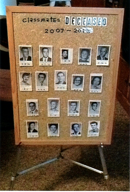 These are the pictures, names and date of death of the 18 classmates that have died in the past 5 years. 2007 - 2012 on display at the 55th reunion. From Top to Bottom - Left to Right William (Bill) Henry, Robert (Bob) Becker, Chris Lopez, Barbara West, Loren (Whitey) Prothe Carol (Bassett) Buchanan, Ronald Hardwick, James Oaks, Mary Gagliardi, Rasella (James) Ginder William (Bill) Gallup, Beverly (Stone) Weisgerber, Larry Tobias, Glenn Durbin Mary Katheryn (Brown) Ferguson, Lillan (Young) Milford, Max Whitworth, Phil Adams |