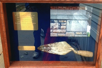 This is the Trough that was used in building Westport in 1908. It was presented to Westport at our 50th Reunion in 2007. It is in our posession looking for a memorial home in a trophy case. The picture of it was taken outside and on a sunny day. A reflection of Lupe's pants and shoes are in the background of the picture along with the side of our house. |