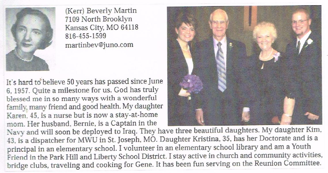 | Jan. 24, 2007 - "Thanks Jim for a great job on the web sight. I have really enjoyed working on the committee for our 50th reunion and I am REALLY looking forward to seeing everyone in October. Sure brings back some good ole memories doesn't it?" Bev (Kerr) Martin | |||||||||